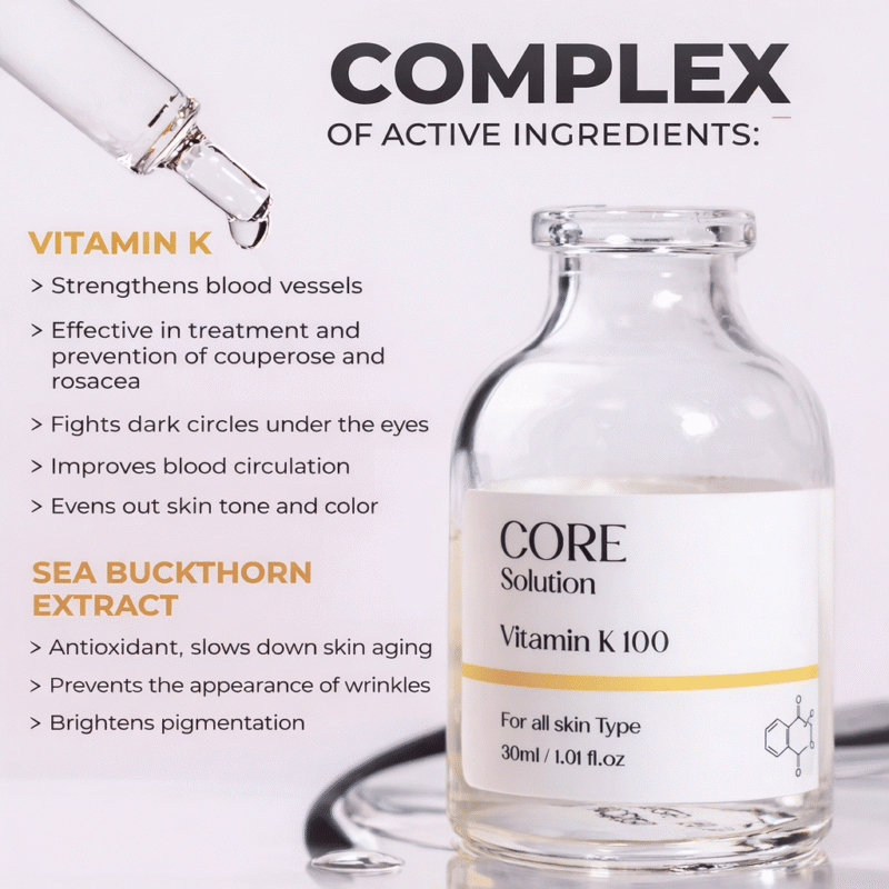This vitamin K solution helps support a more even skin tone by conditioning the skin and reducing the appearance of uneven pigmentation. It can be applied manually as part of daily care or used with professional devices such as mesorollers, dermapens, ultrasound, phonophoresis, microcurrent lifting, and electroporation to enhance penetration and results. Finish with a moisturizing or nourishing cream. Not for injection.