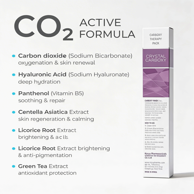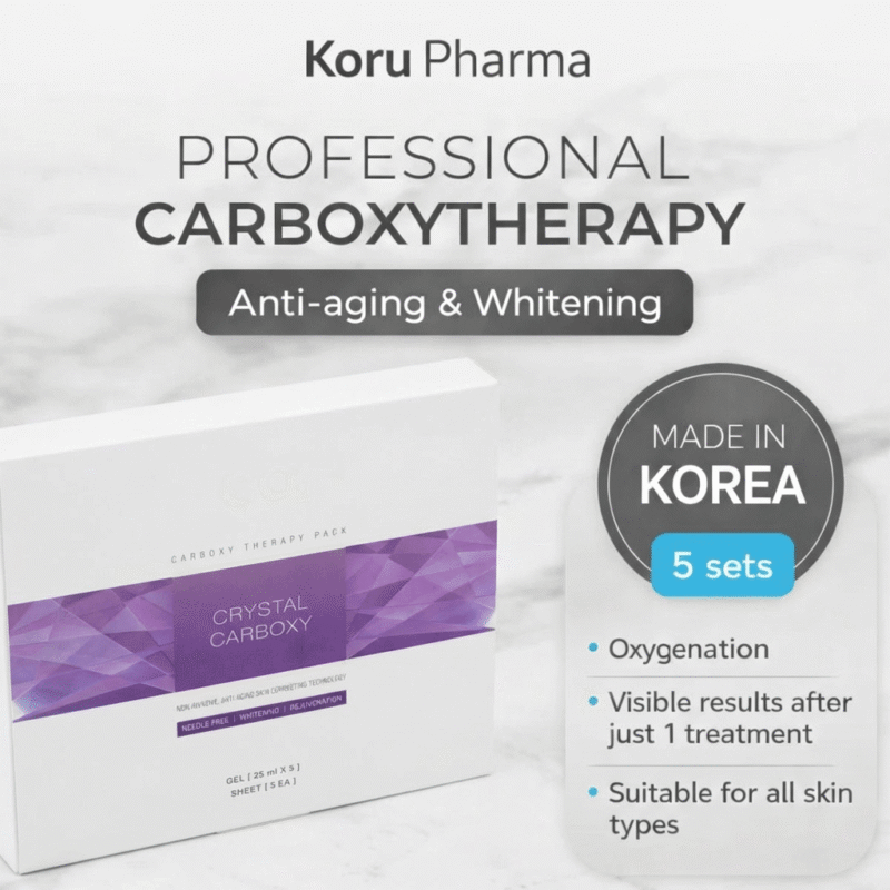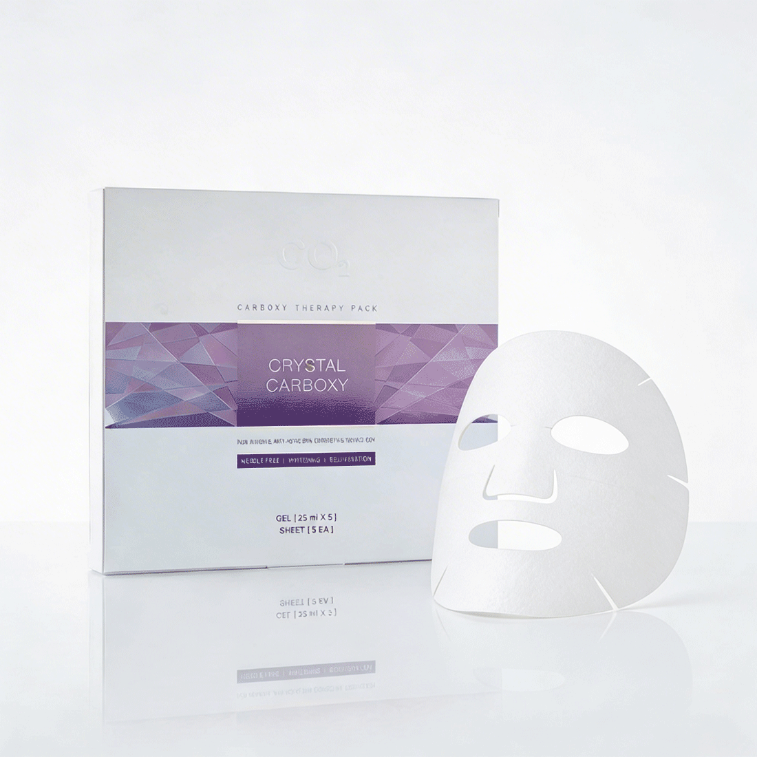 Koru Pharma Crystal Carboxy CO2 Gel Mask professional non-invasive carboxytherapy treatment formulated to oxygenate the skin, improve circulation, and support smoother, brighter, and more elastic-looking skin with lifting and detoxifying effects.