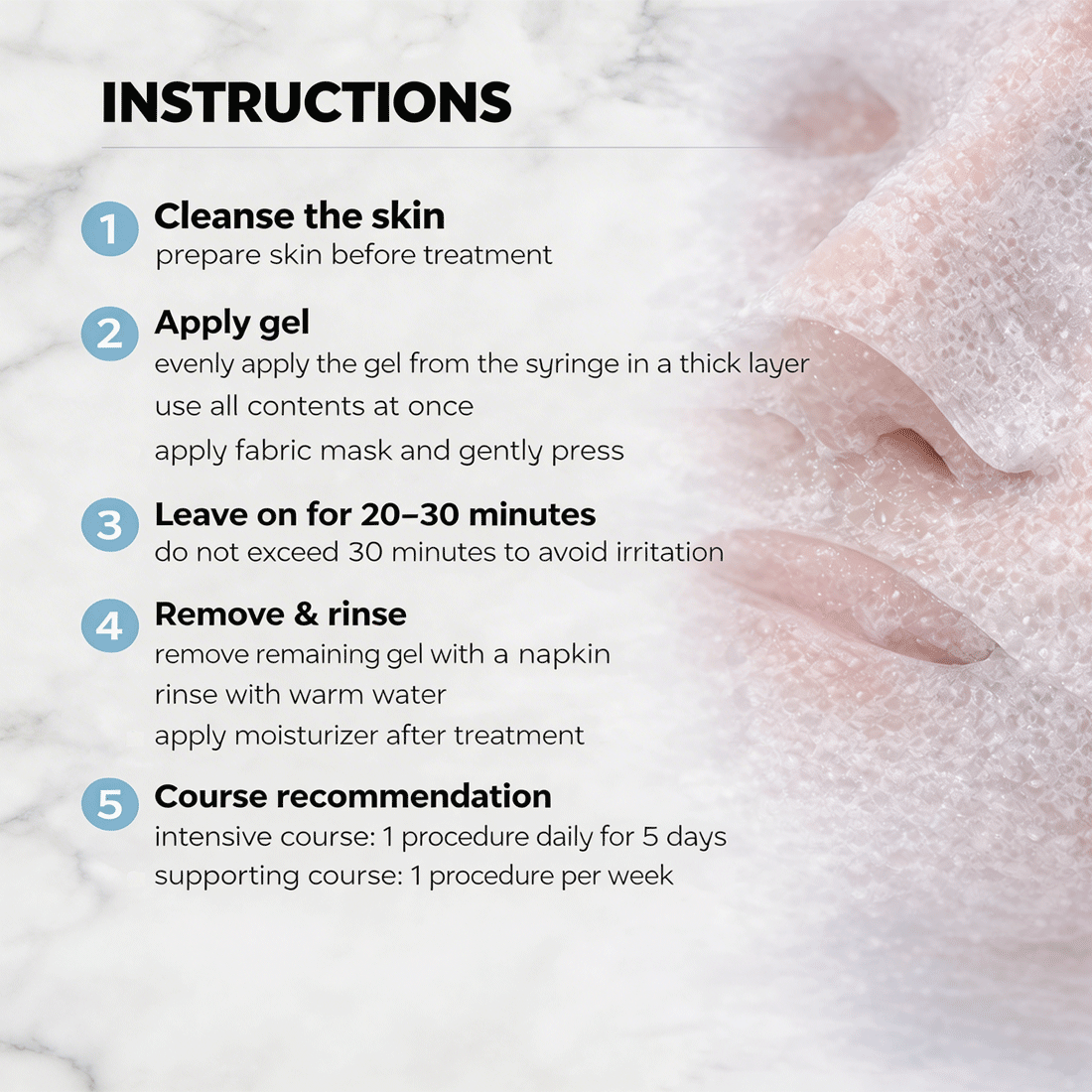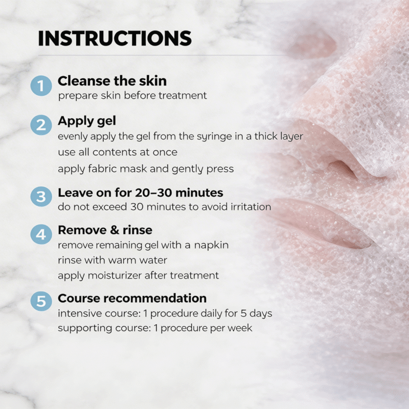 The gel reacts with the mask to generate carbon dioxide (CO2), which penetrates the skin and triggers the Bohr effect. This process increases oxygen delivery from blood cells to the skin, improving circulation, stimulating collagen production, enhancing metabolism, and supporting detoxification for visibly healthier skin.