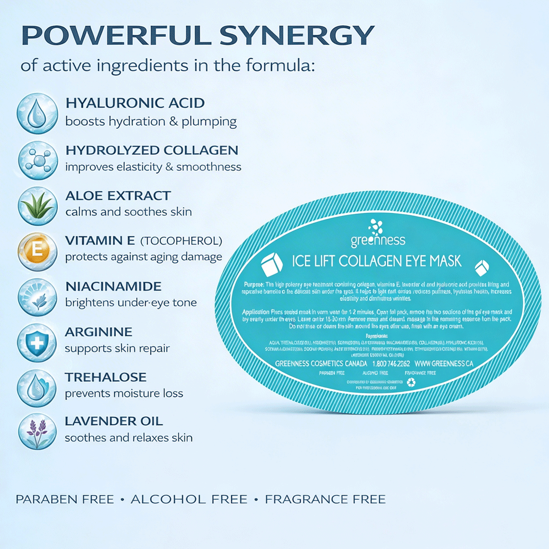 Ice Lift Hydrating Collagen Eye Mask professional under-eye treatment formulated to hydrate, firm, and brighten the delicate eye area while reducing puffiness, smoothing fine lines, and restoring a refreshed, youthful appearance.