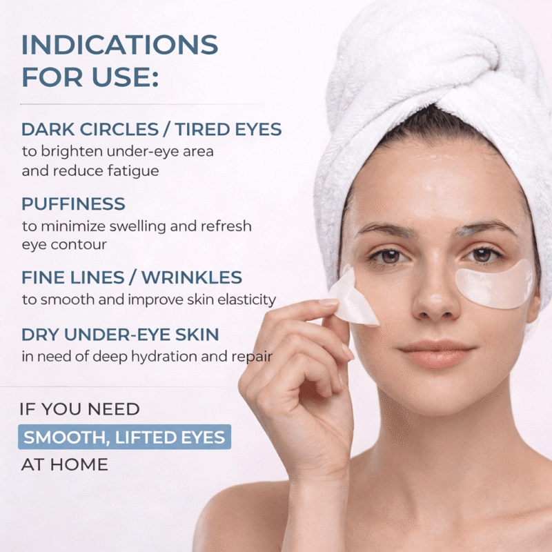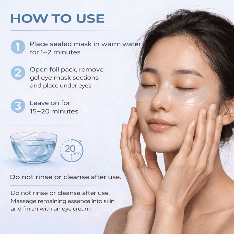 The gel eye patches deliver collagen, hyaluronic acid, and active ingredients into the delicate under-eye area, helping to hydrate, improve elasticity, and reduce visible signs of fatigue. The cooling effect helps minimize puffiness and refresh tired-looking eyes.