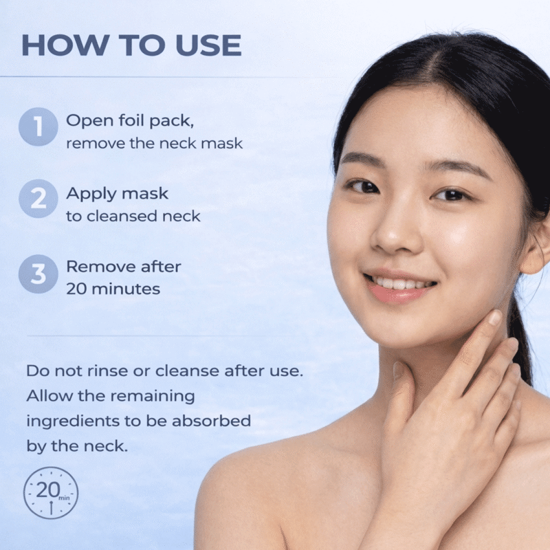 The gel neck mask delivers collagen, hyaluronic acid, and active ingredients into the skin, helping to improve elasticity and hydration. Its occlusive structure enhances absorption, supporting skin repair and tightening for a visibly smoother and firmer neck area.