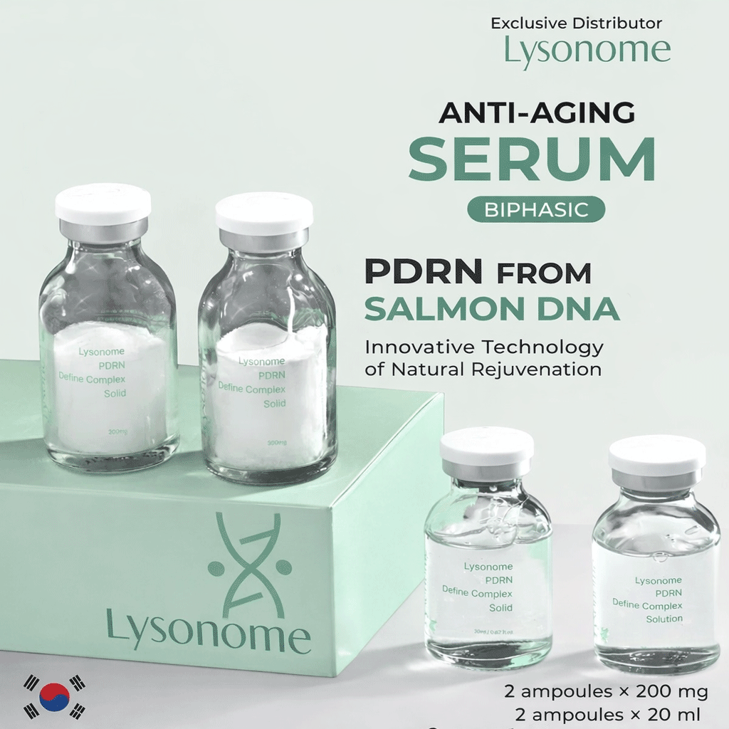 Lysonome PDRN Define Complex dual-phase freeze-dried ampoule system formulated with PDRN, peptides, and collagen to support skin regeneration, elasticity, and visible brightening. Designed to improve firmness and refine uneven, aging skin.