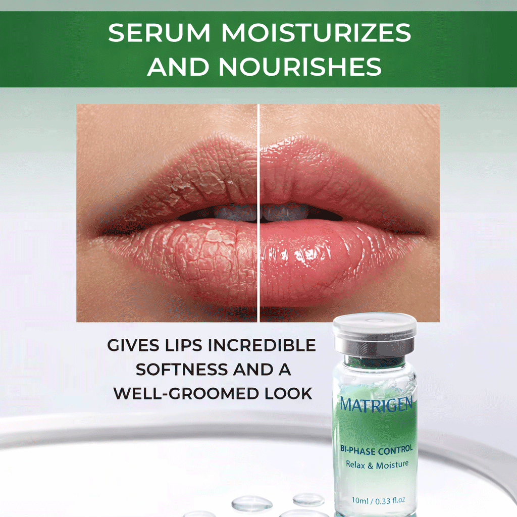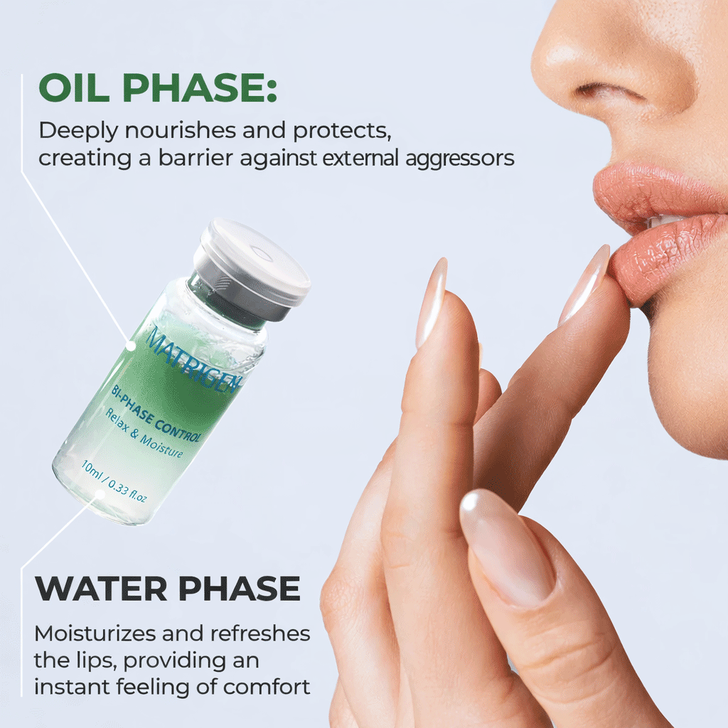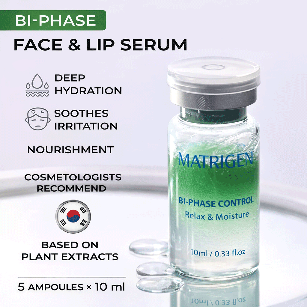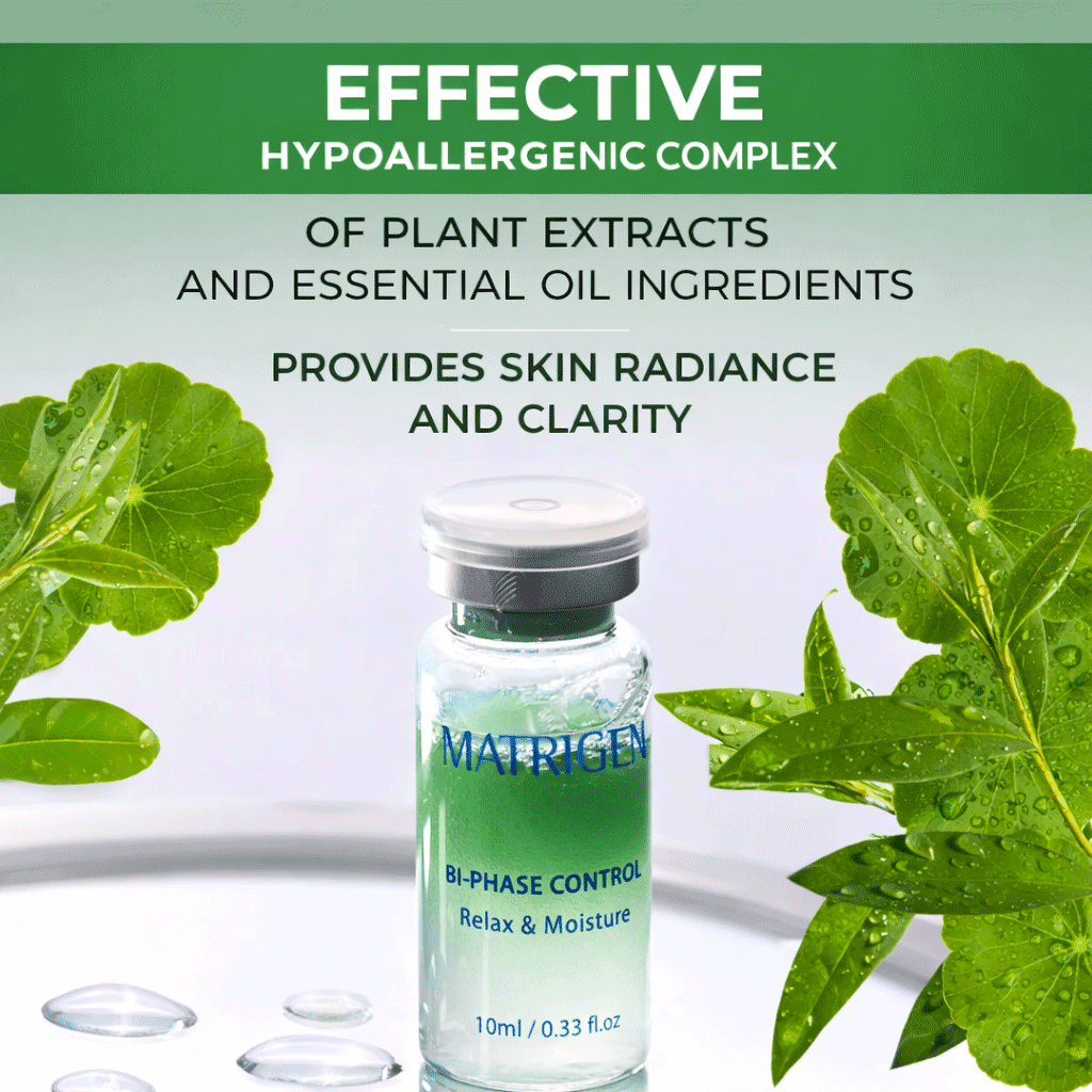 Matrigen BiPhase Control Relax & Moisture Ampoule professional soothing serum formulated to deeply hydrate, calm sensitive skin, and restore oil-water balance while delivering lightweight nourishment without heaviness or stickiness.