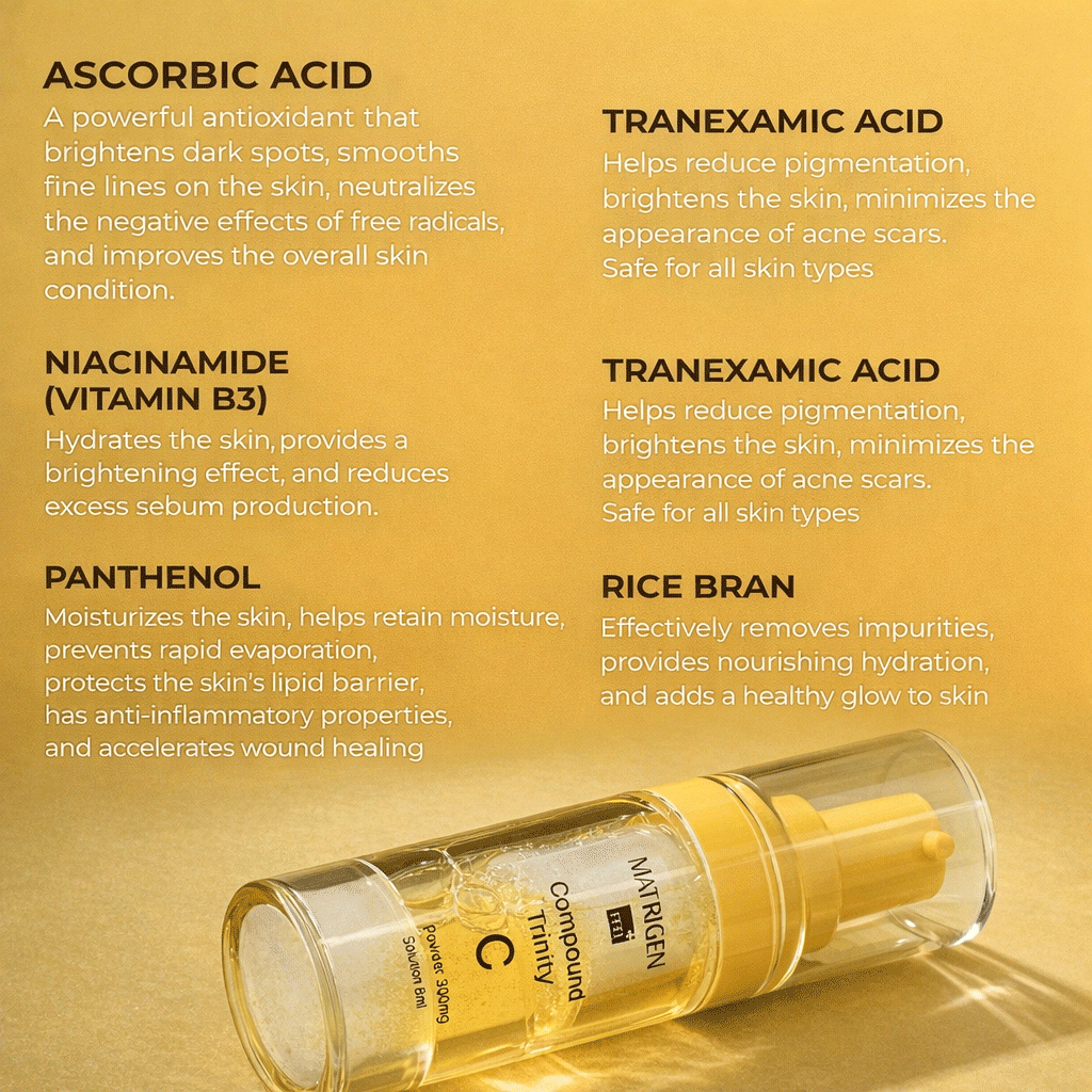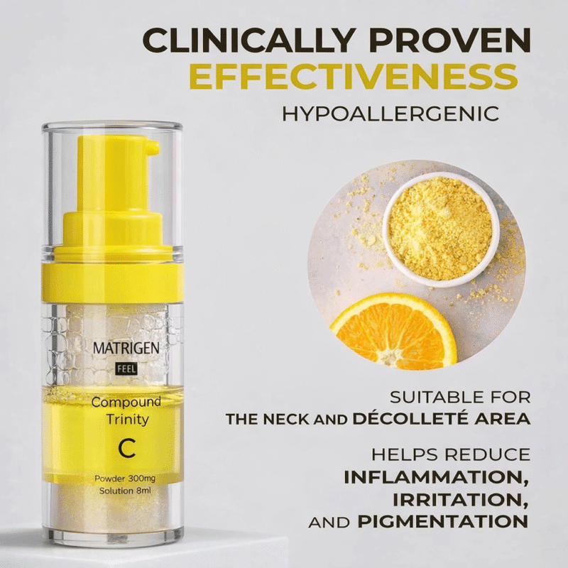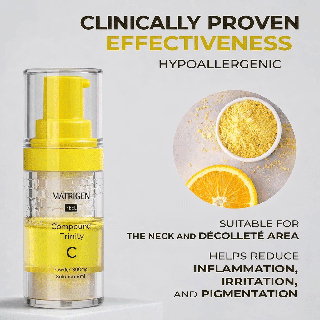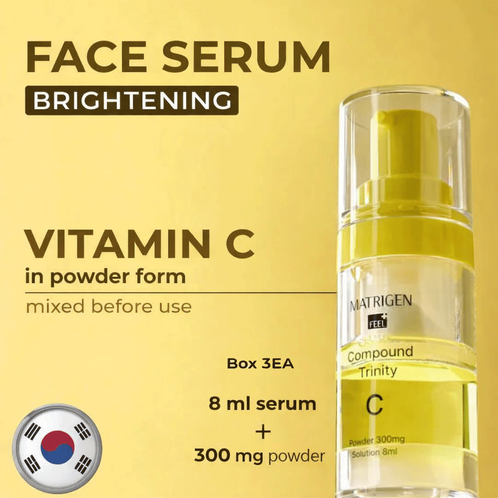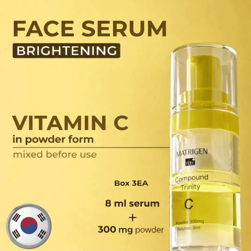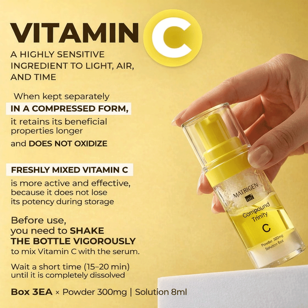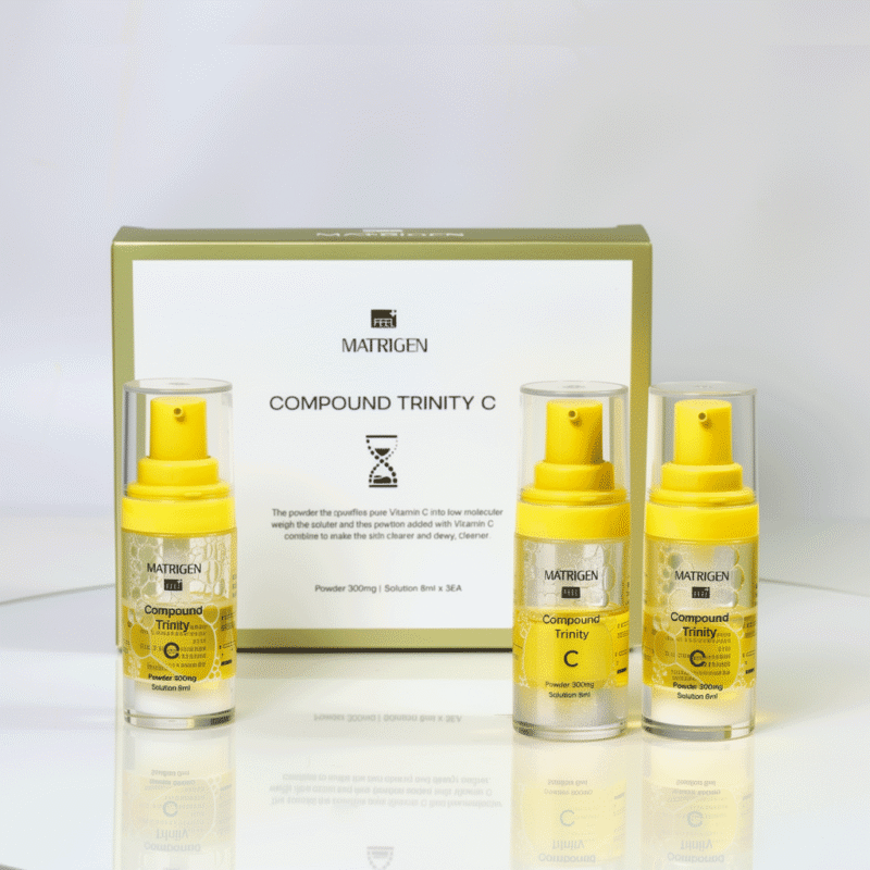 Matrigen Compound Trinity C professional vitamin C ampoule system formulated with a powder-and-solution blend to brighten dull skin, improve tone clarity, enhance radiance, and deliver fresh, highly concentrated antioxidant care.