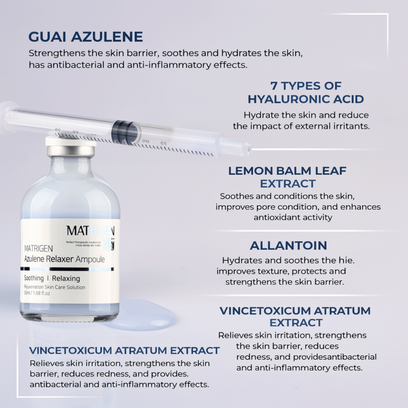 Calming and soothing ampoule designed to reduce redness, relieve irritation, and hydrate sensitive skin with azulene, centella, and botanical extracts for deep comfort and balance.