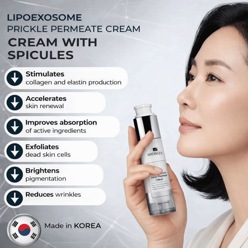 Matrigen LipoExosome Prickle Permeate Cream professional liquid microneedling cream formulated with spicules, exosomes, PDRN, and barrier-repair actives to enhance absorption, improve elasticity, support skin regeneration, smooth texture, and strengthen the skin barrier.