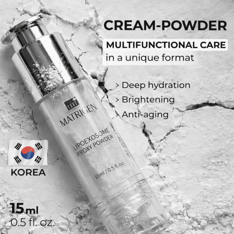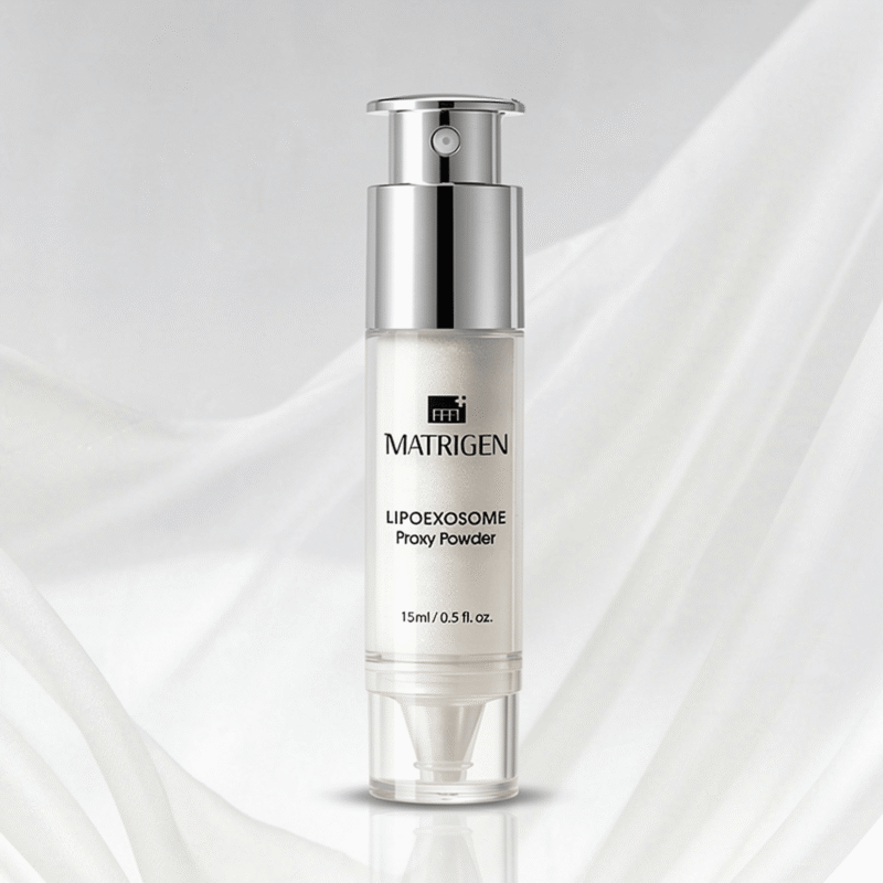 Matrigen LipoExosome Proxy Powder professional powder-to-cream treatment formulated with exosome-enriched actives and Pro-Xylane to improve skin elasticity, enhance hydration, smooth rough texture, brighten dull tone, and deliver lightweight, non-sticky intensive care.