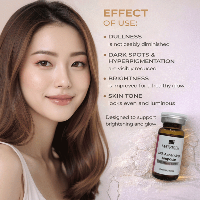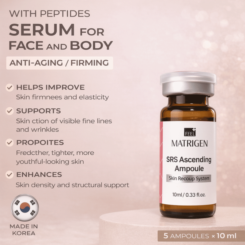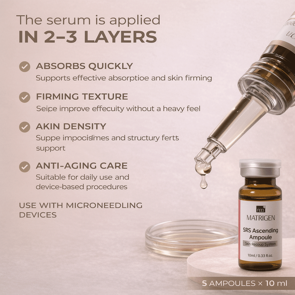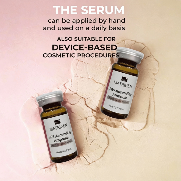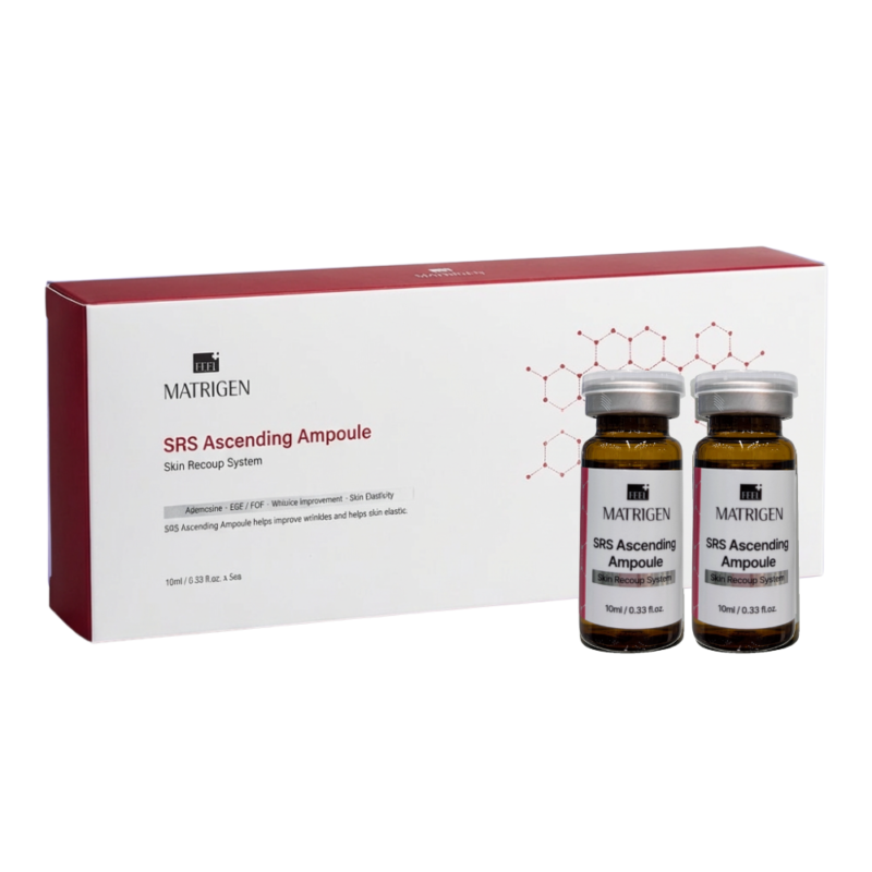 Matrigen SRS Ascending Ampoule professional anti-aging ampoule formulated to improve firmness, enhance elasticity, and visibly reduce wrinkles while supporting a lifted, strengthened skin appearance during advanced aesthetic treatments.