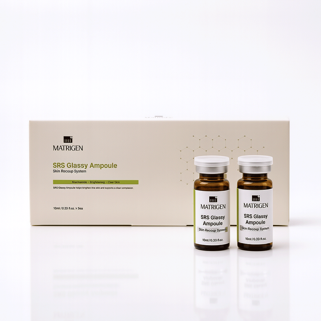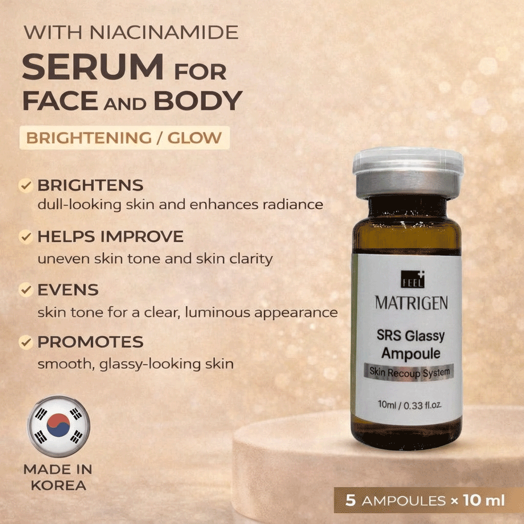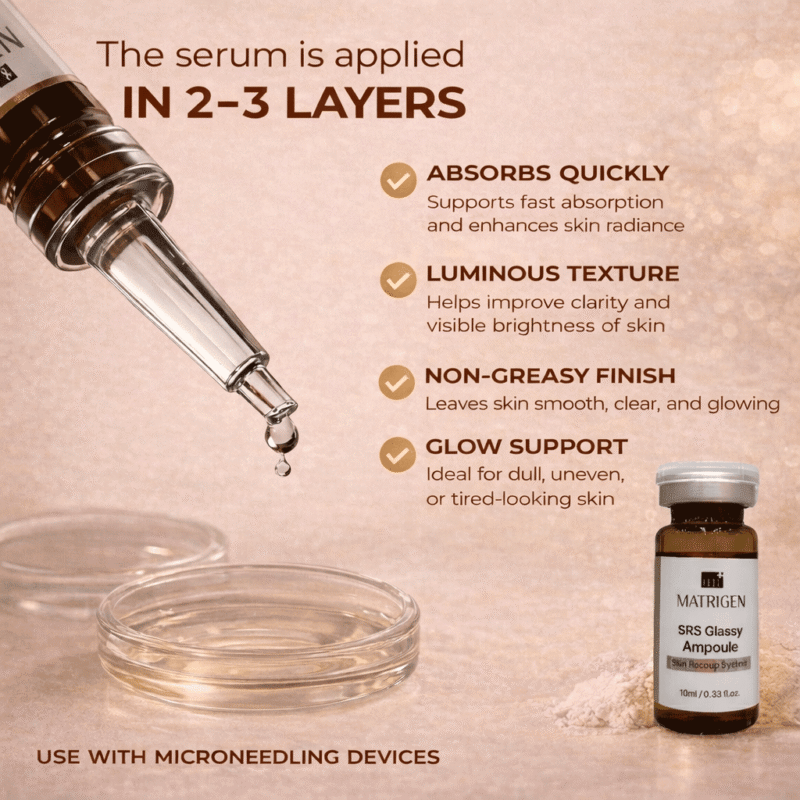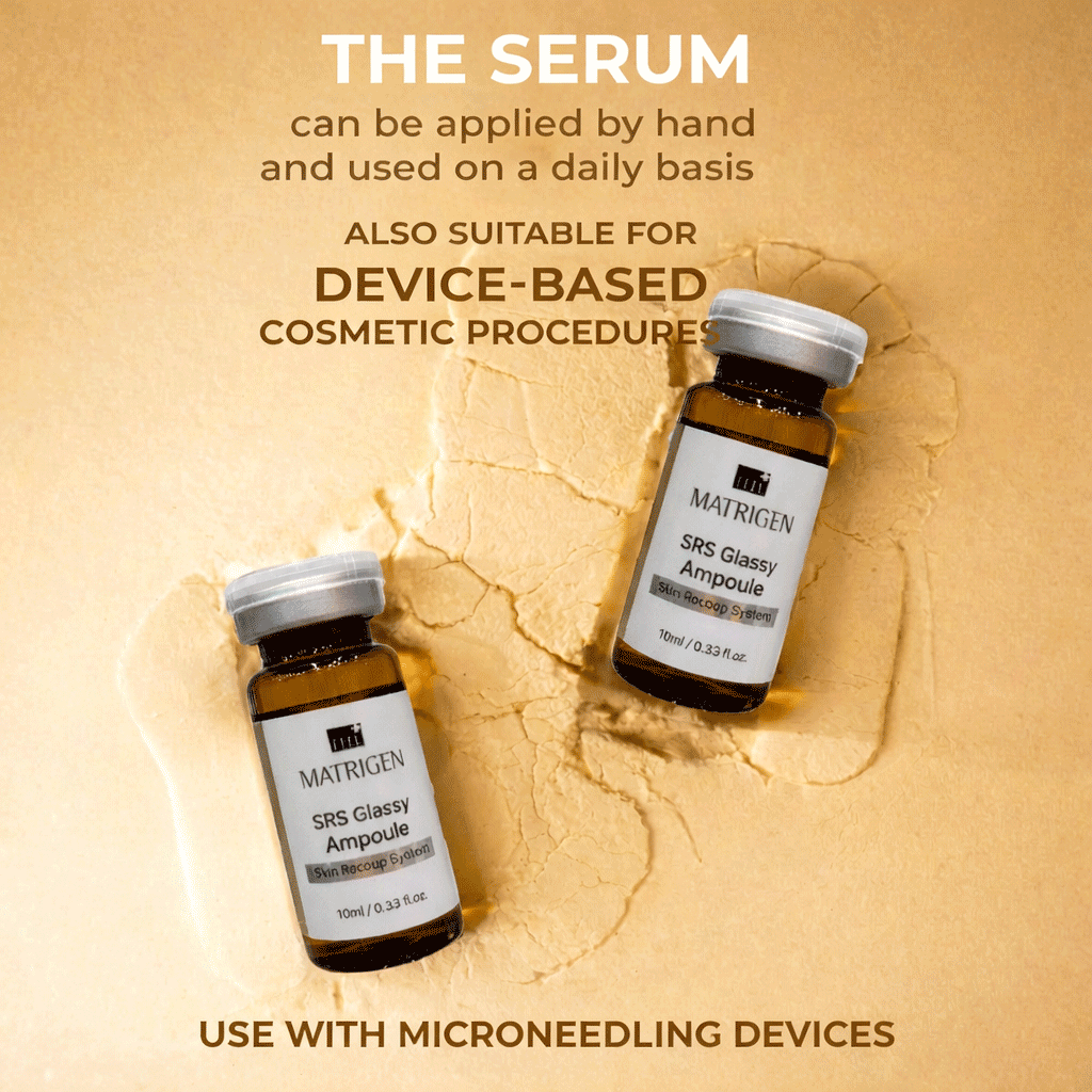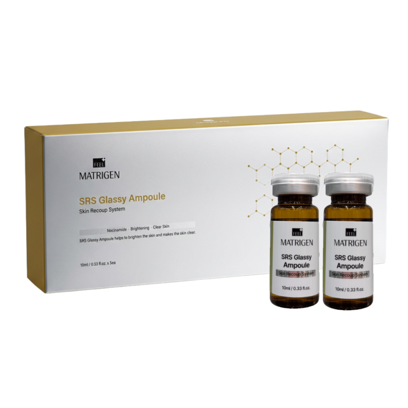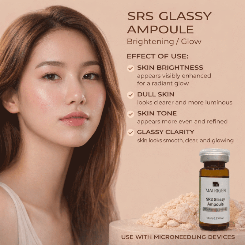Matrigen SRS Glassy Ampoule professional brightening ampoule formulated to enhance radiance, even skin tone, and deliver a clear, luminous “glassy skin” effect during aesthetic treatments.