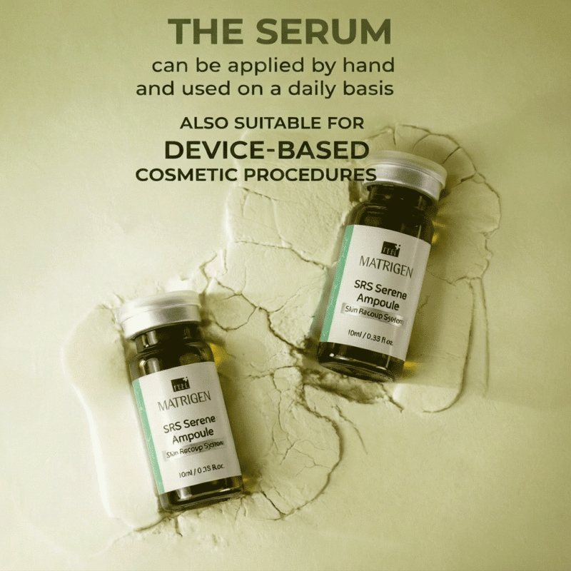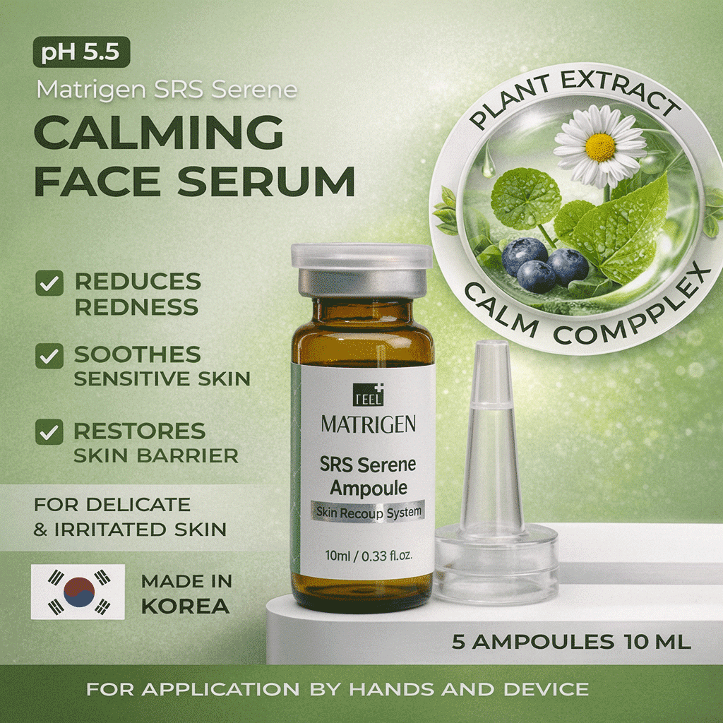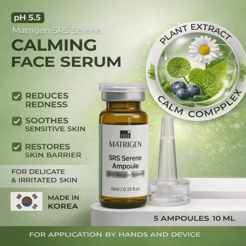 Matrigen SRS Serene Ampoule professional calming ampoule formulated to reduce visible redness, soothe sensitive skin, and reinforce the skin barrier during aesthetic and device-based treatments.