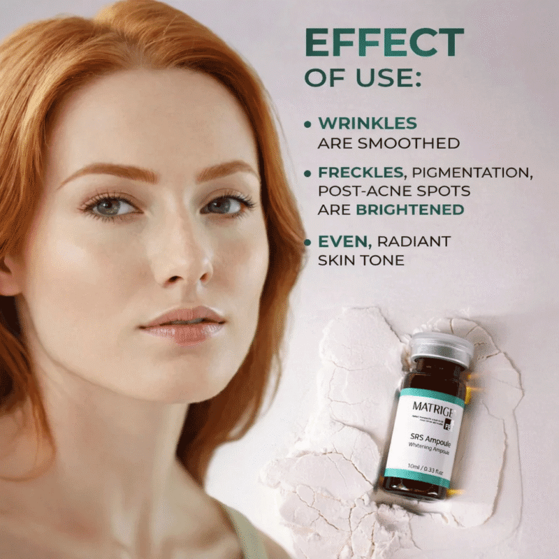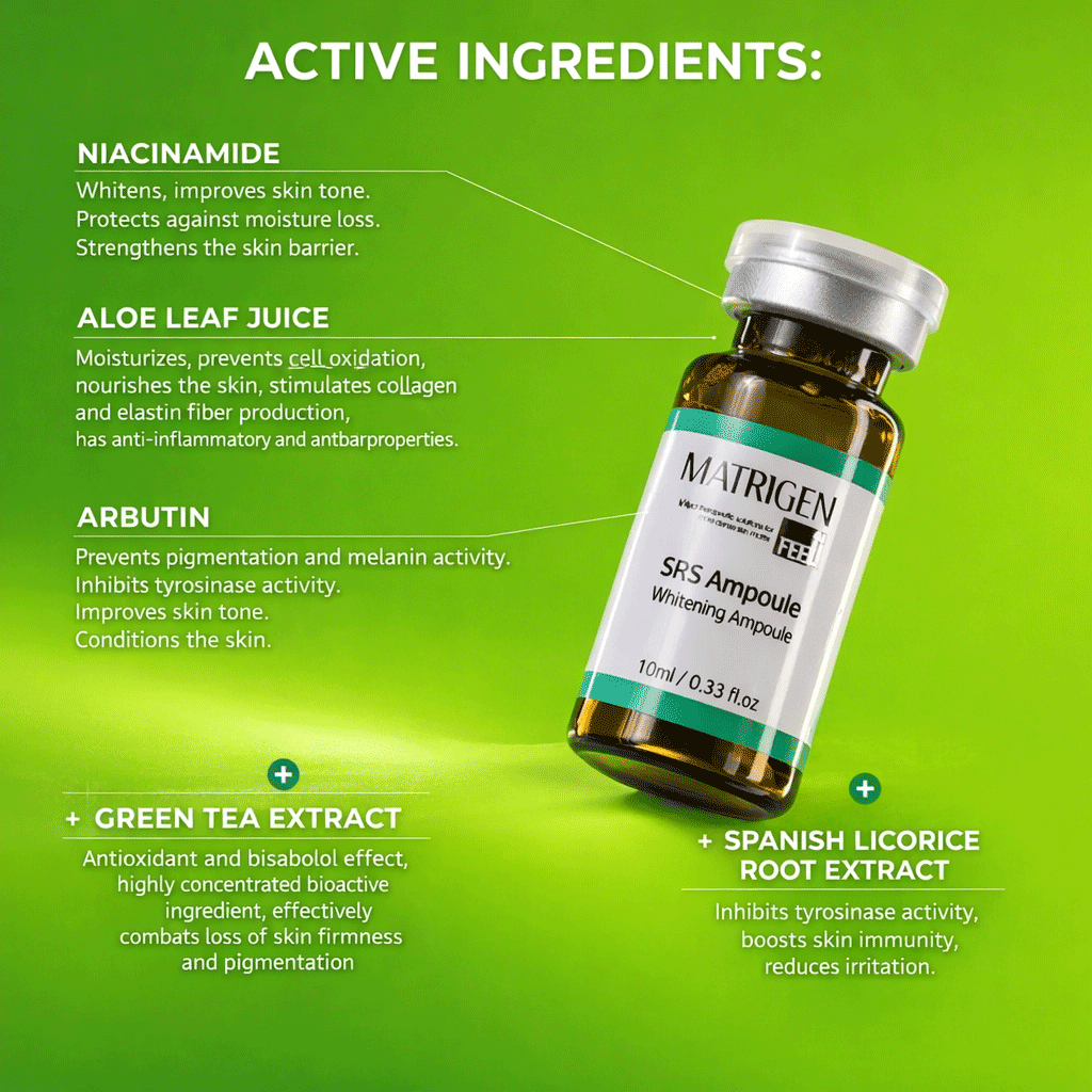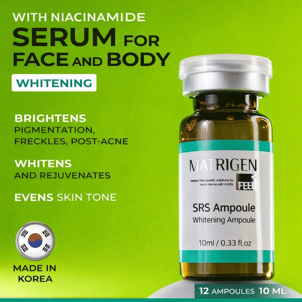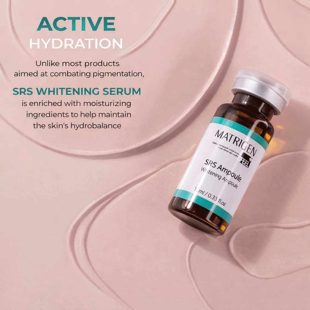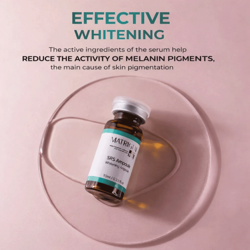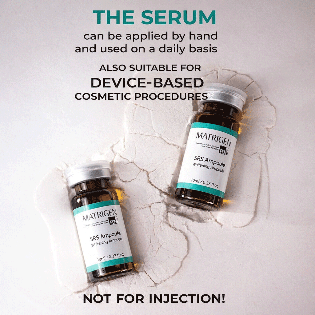 Matrigen SRS Whitening Ampoule professional brightening ampoule formulated with niacinamide, botanical extracts, and peptides to improve uneven tone, reduce dullness, and enhance skin clarity while keeping skin hydrated and balanced.