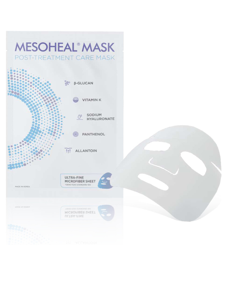 The Mesoheal mask is an ultra-fine microfiber sheet mask containing Vitamin K (Menadione), beta-glucan, Panthenol, Allantoin, and Sodium Hyaluronate that has been specially formulated to hydrate, soothe and repair dry, irritated skin for the ultimate aftercare following a cosmetology treatment.