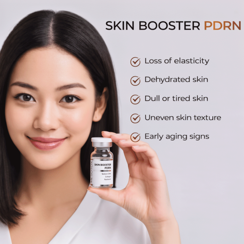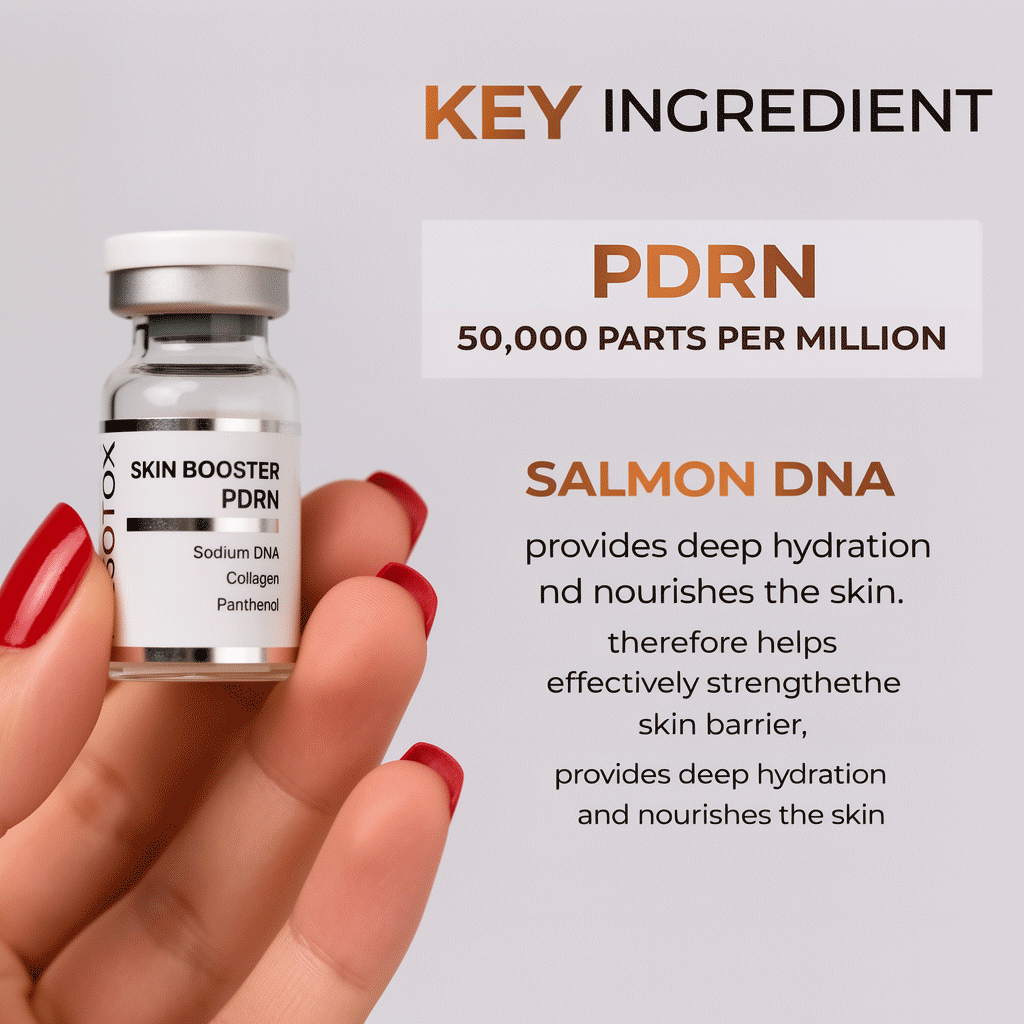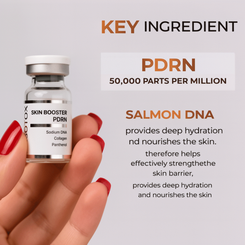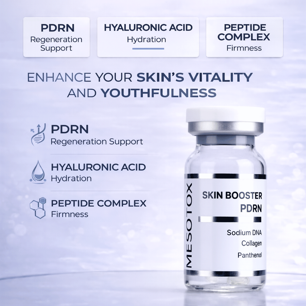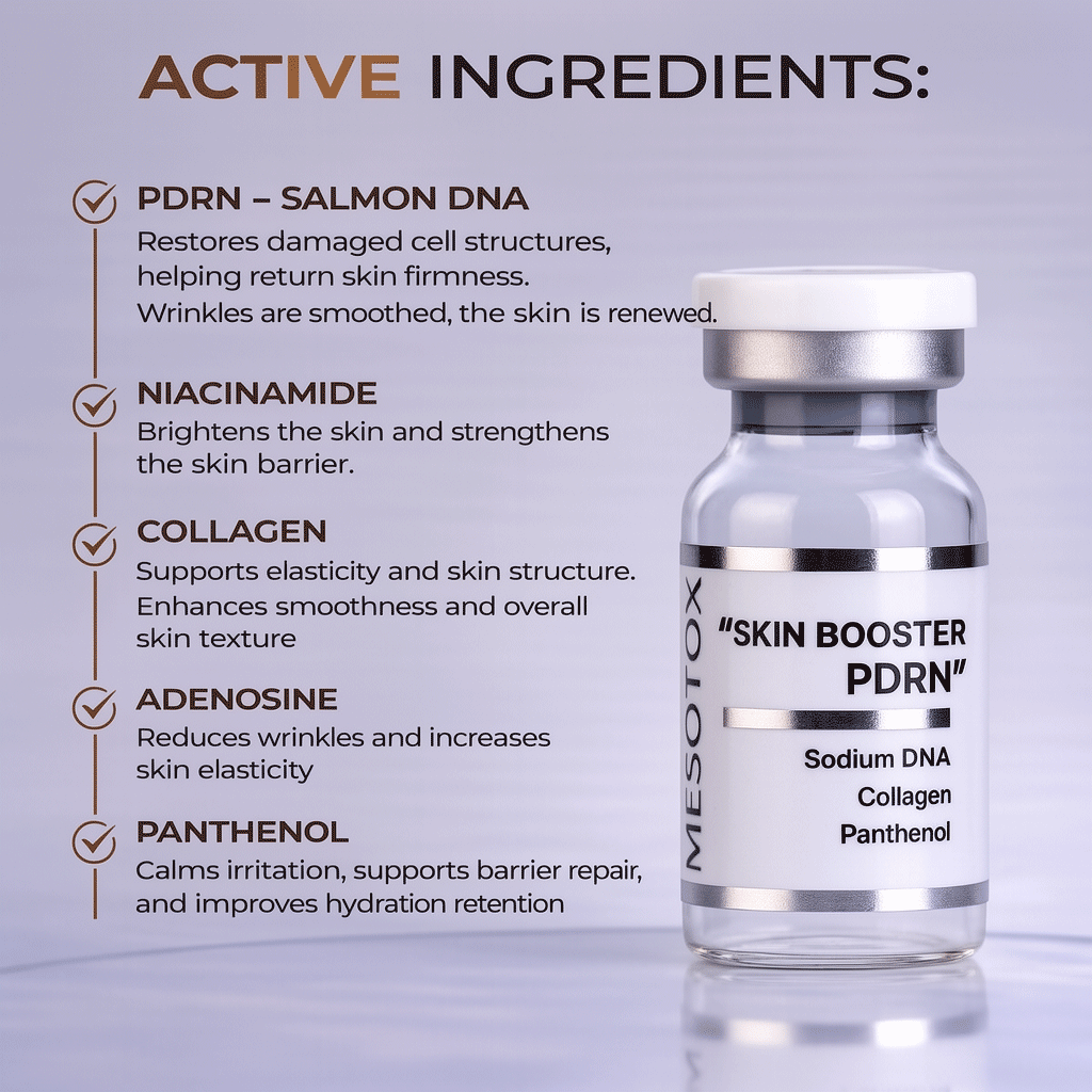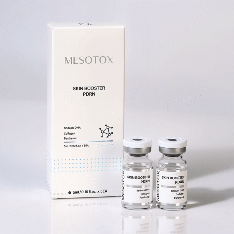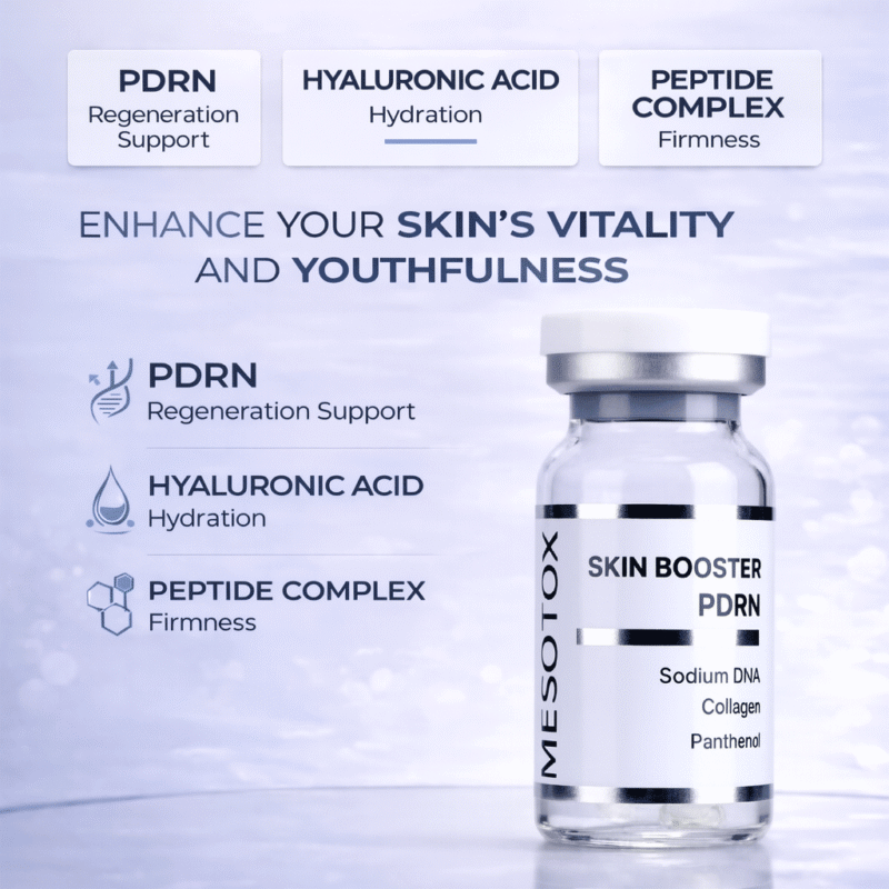 Mesotox Skin Booster PDRN combines Sodium DNA (PDRN) and Sodium Hyaluronate to support skin cell regeneration, stimulate collagen synthesis, improve elasticity, and enhance moisture retention when used in professional mesotherapy or microneedling treatments.