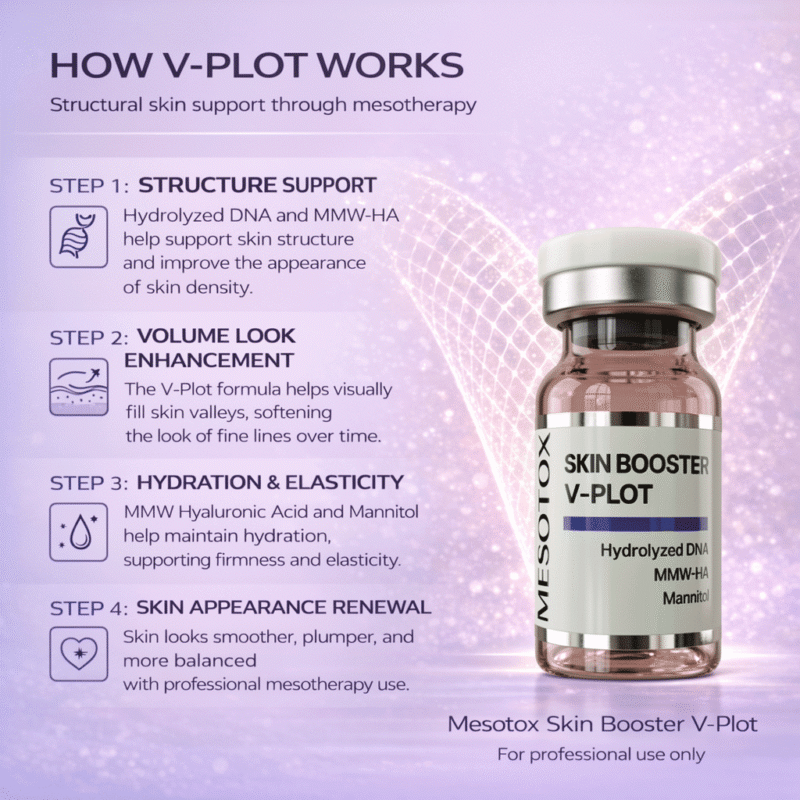 Mesotox Skin Booster V-PLOT works through a bio-stimulatory mechanism using polylactic acid to activate fibroblasts and encourage natural collagen production. Hyaluronic acid supports hydration and skin elasticity, while gradual integration improves firmness, density, and overall skin quality over time.