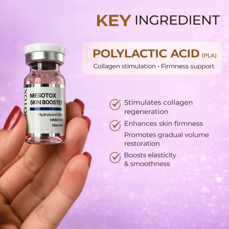 Polylactic Acid (PLA): A bio-stimulatory ingredient that activates fibroblasts to support natural collagen production, improving skin firmness, thickness, and elasticity over time.