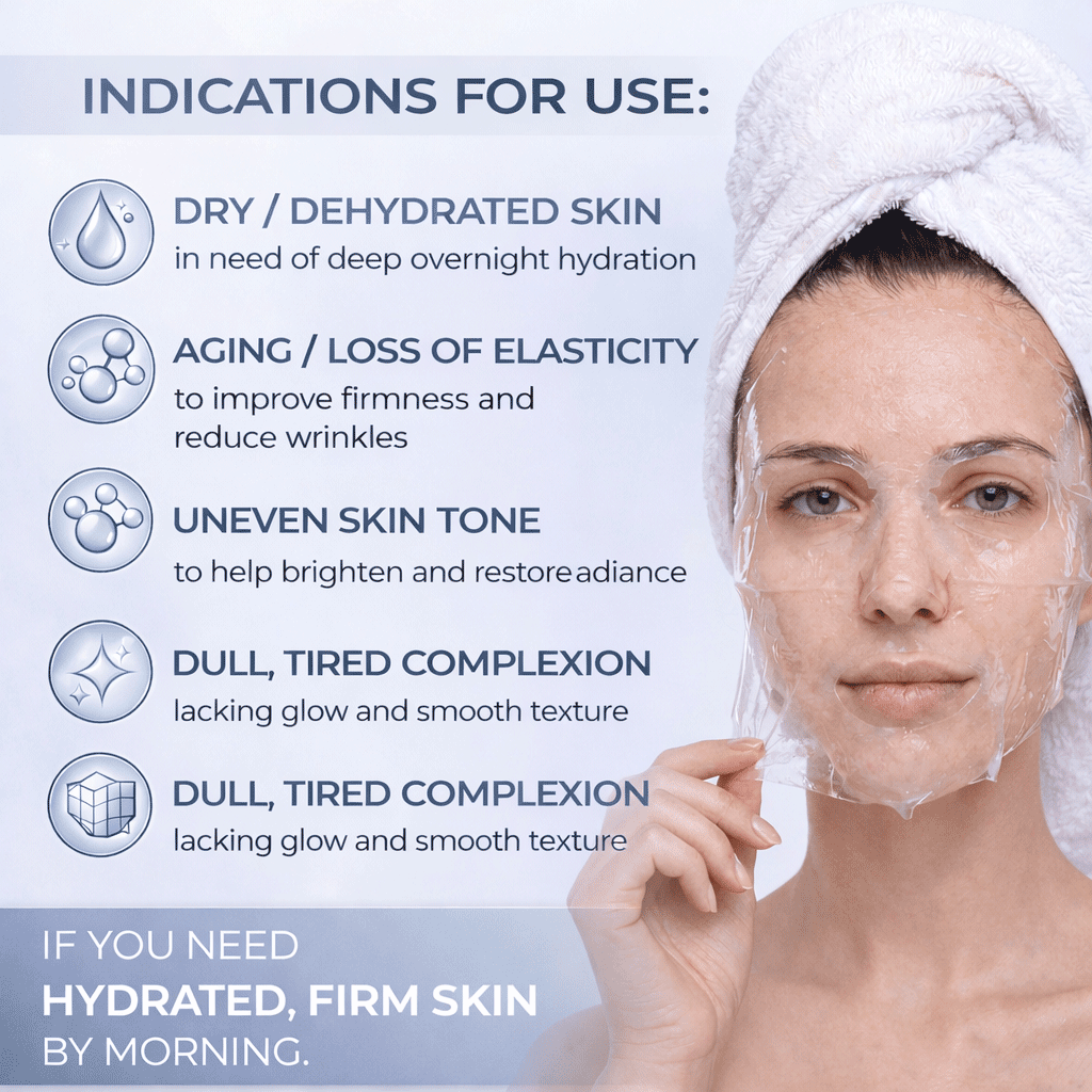 The hydrogel mask delivers active ingredients such as collagen, peptides, and hyaluronic acid into the skin, helping to improve elasticity and hydration. Its occlusive structure enhances absorption, while peptides support skin firming and smoothing, resulting in a lifted and rejuvenated appearance.