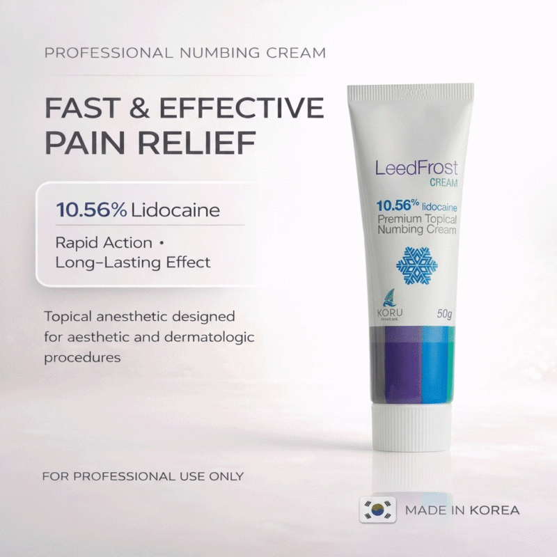 Koru Pharma Leed Frost Topical Aesthetic Numbing Cream – 500g professional high-strength anesthetic cream formulated with 10.56% lidocaine to provide fast-acting, long-lasting numbing effect for aesthetic procedures, ensuring enhanced comfort and reduced sensitivity during treatments.